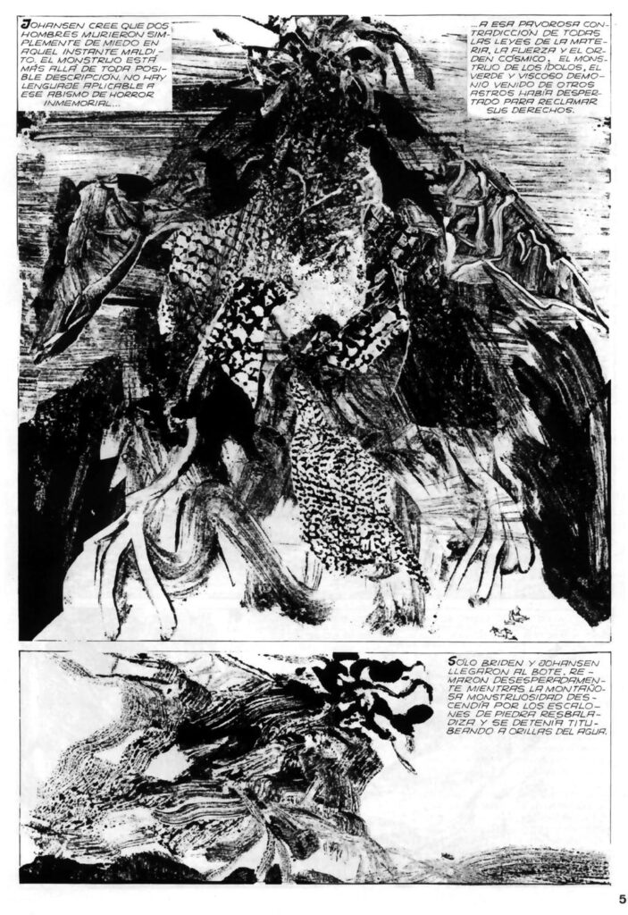 Mity Cthulhu są jednym wielkim eksperymentem artystycznym, który Alberto Brecci wyszedł doskonale i którego efekty natychmiastowo windują go do grona moich ulubionych artystów komiksowych. W pracach Brecci jest lovecraftowy klimat, psychodelia ,tajemniczość, poczucie nieznanego, przedwieczny horror, szaleństwo i wszystko to, co w opowiadaniach samotnika z Providence. Jest to niesamowite, ale udało się przenieść na karty komiksu to wszystko, co wywołało we mnie takie uczucia, jakich doznałem, gdy pierwszy raz przeczytałem opis Shoggotha w scenie pościgu w opowiadaniu „W Górach Szaleństwa” Jest to taka wizja, w której widzi się tylko urywek czegoś, przez sekundę, kątem oka i doznaje się przy tym uczucia, że spojrzało się za zasłonę rzeczywistości, a jednocześnie uderza poczucie, że już nigdy więcej nie chce se na taką grozę spojrzeć. Z jednej strony nie wiemy, co zobaczyliśmy, z drugiej, ten obraz zostaje w umyśle do końca życia. Taka jest siła prozy Lovecrafta i taka jest siła rysunków Alberta Brecci. Rysownik sięga tu po ogromny wachlarz technik i środków wyrazu, realistycznych, ekspresyjnych, psychodelicznych, symbolicznych, minimalistycznych (pewnie GoroM potrafiłby je opisać i nazwać, ja nie), ma różnorodność styli (porównywalną z Moebiusem), a wszystkie one pasują idealnie do opowiadań. Niby dostajemy obraz czegoś, co dane jest nam oglądać, ale do końca nie wiemy, na co patrzymy, albo nie chcemy wiedzieć, co ogromnie sprzyja działaniu wyobraźni i to w taki sposób, w który nie chcemy, żeby działała, bo podsuwa nam prawdziwe horrory. Nieraz Breccia jest niemal hiper realistyczny a nieraz tylko sugeruje coś…no właśnie co….zastanawiamy się, niby wiemy, ale….. nie chcemy wiedzieć……